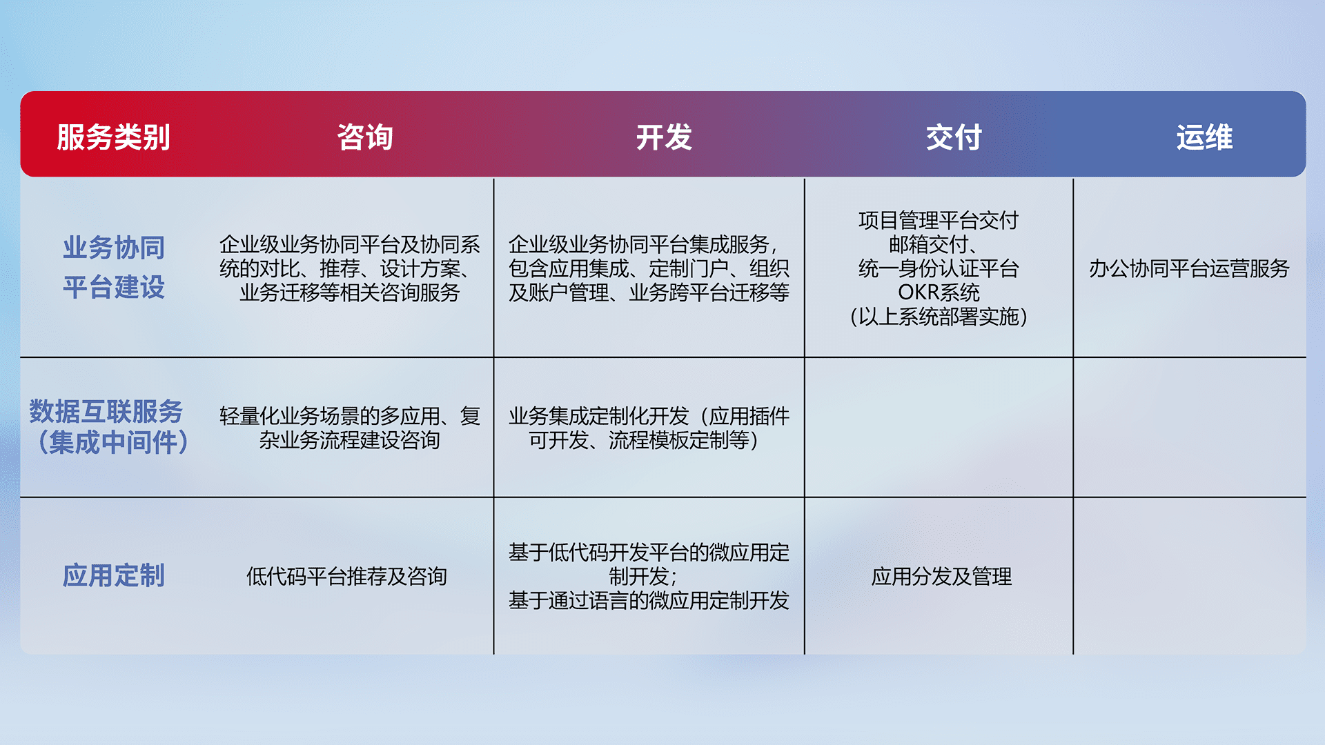 针对钉钉、、、、企微、、IDaas等平台级产品提供产品的规划、、、、方案、、、交付、、、、定制化开发等服务,,实现如统一协同办公、、智能客户服务、、混合会议管理、、、智能数据查询、、等业务场景,,实现数字化转型。。。